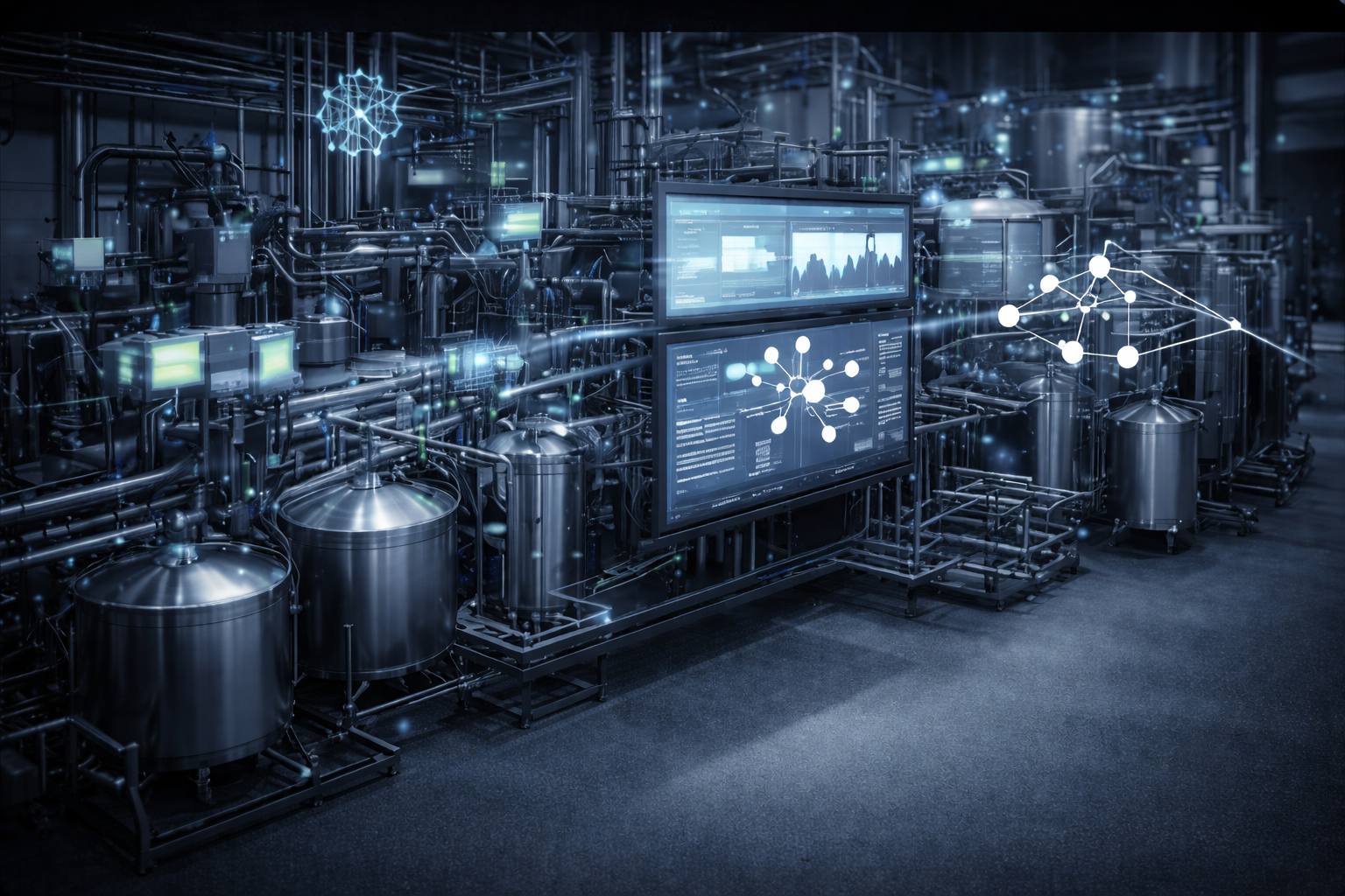 For a given manufacturing line, the AI model is developed from first principles of engineering and applied mathematics, incorporating core process engineering, statistical learning techniques, and advanced neural network architectures. The solution involves mathematical modeling of key process equipment, including kinematic behavior of material flow, mechanical dynamics, and inherent process non-linearities.